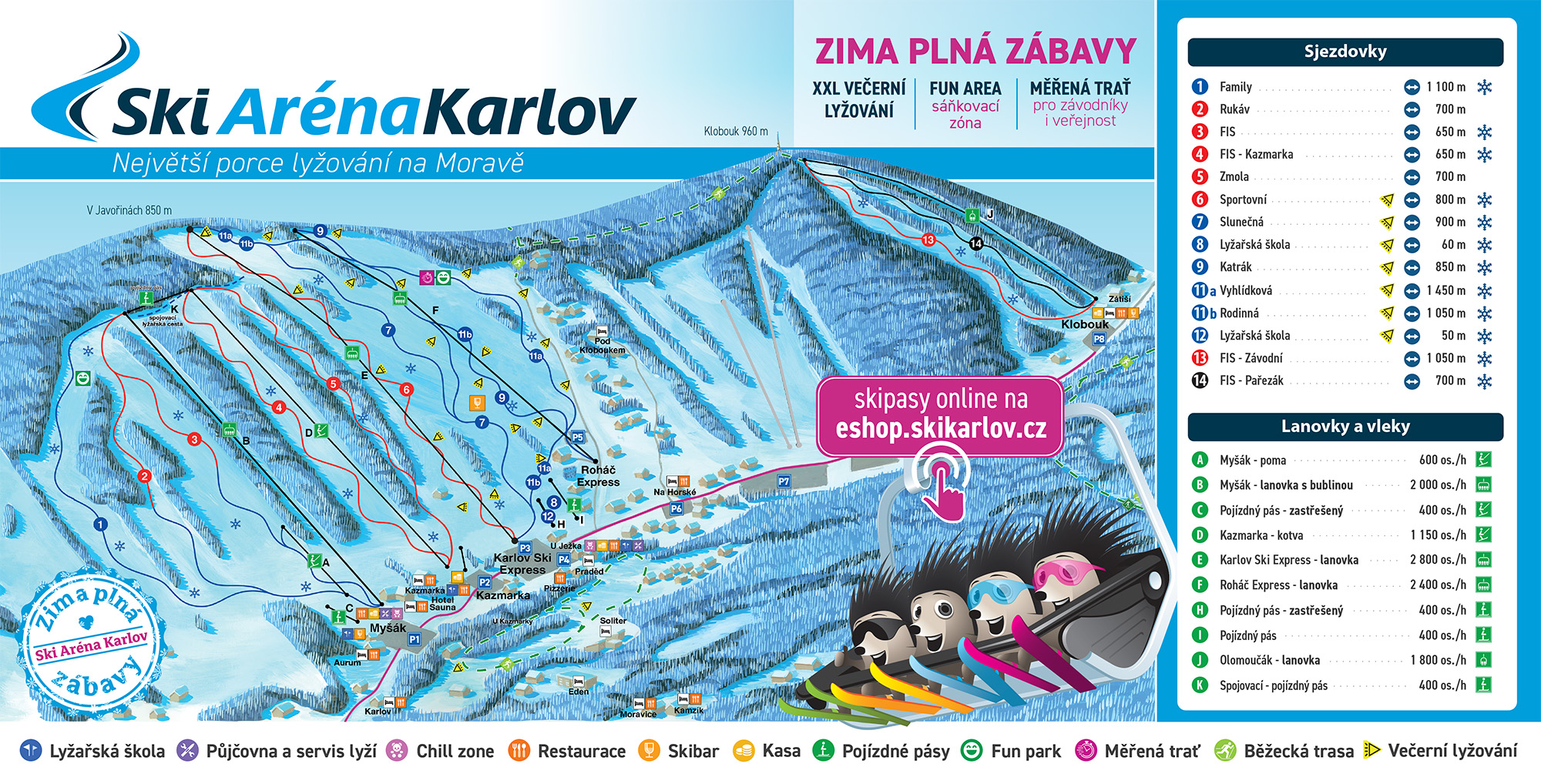 You can buy your ski pass online on our website or directly at the ticket offices in the resort. For discounts and special offers, we recommend registering in our e-shop and purchasing your ski pass in advance online (SKI ARÉNA KARLOV E-SHOP).