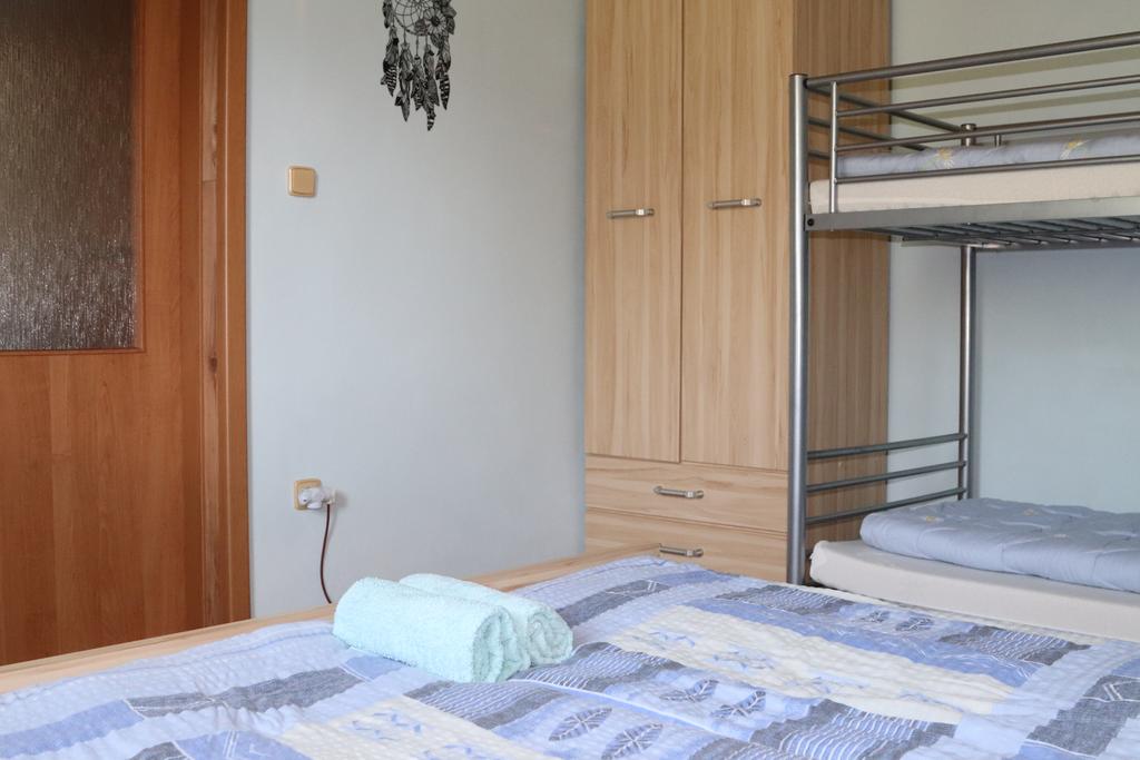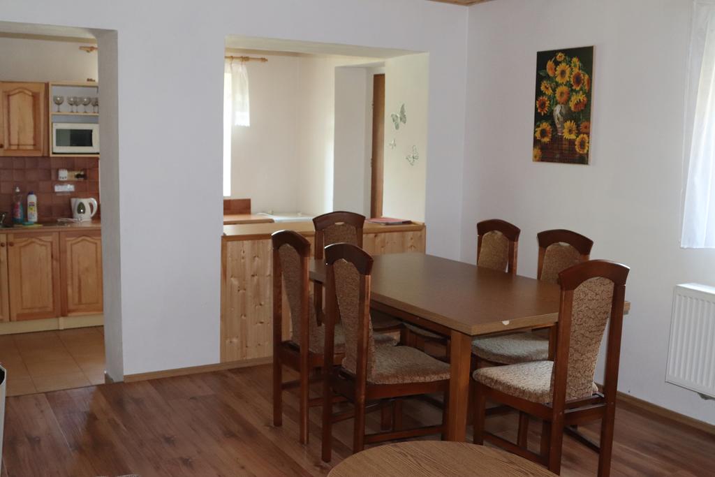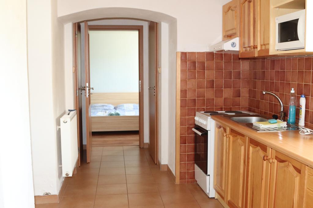 Apartmán je pro 6 osob + přistýlka. Je rozdělen na ložnici se čtyřmi lůžky a obývací část, kde je rozkládací pohovka pro 2 ososby, velký jídelní stůl a kuchyňský kout. Koupelna je vybavena sprchovým koutem. Samozřejmostí je TV a připojení k internetu. V létě je pro děti k dispozici bazén, pro všechny pak posezení v altánu s možností grilování. Pro zpříjemnění večerů nabízíme možnost zakoupení kvalitních stáčených vín.